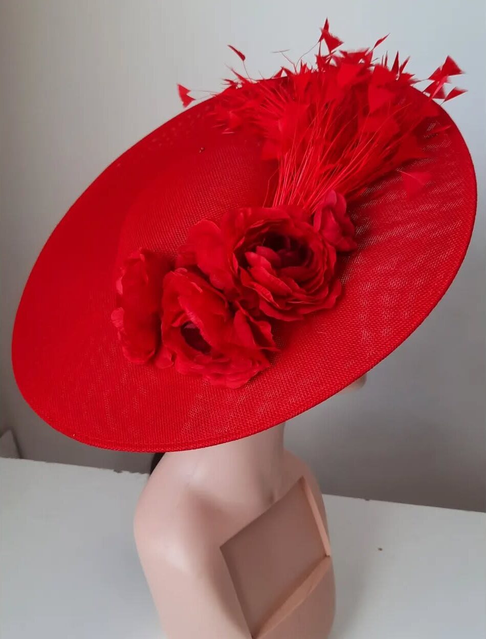 Red wide-brim hat with red roses and red goose feathers